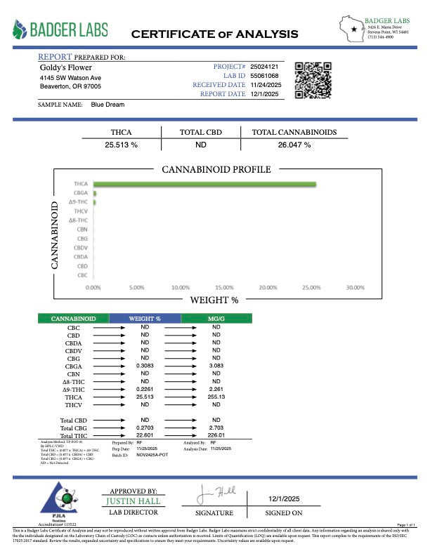 Sun-grown in small batches and slow-cured for terpene preservation and clarity. Grown from original-era Blue Dream genetics selected for balance, flavor, and daytime usability. Each batch is third-party tested for potency and purity.