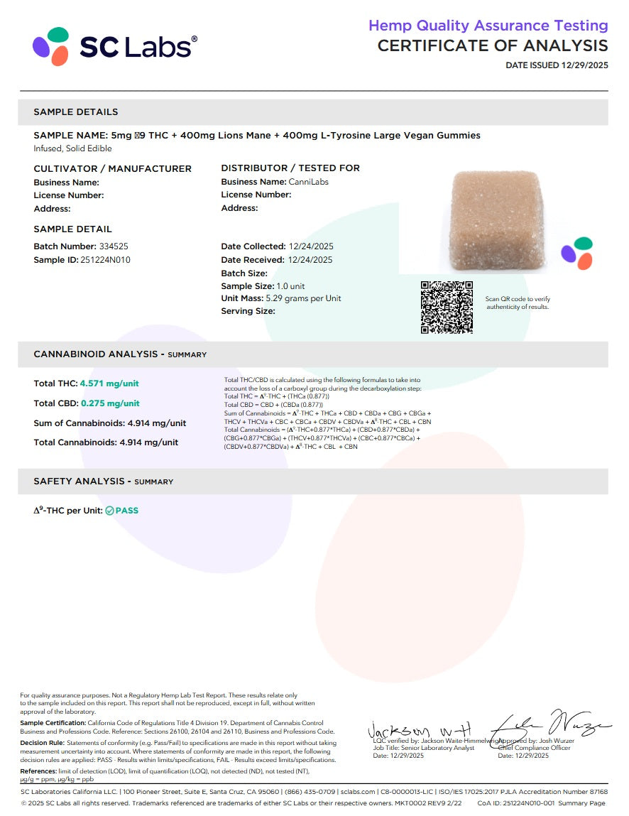 Potency per Gummy: 5 mg Δ9-THC · ~0.27 mg CBD · 400 mg Lion’s Mane · 400 mg L-Tyrosine