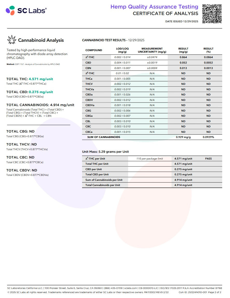 Each vegan gummy delivers 5 mg hemp-derived Delta-9 THC paired with Lion’s Mane and L-Tyrosine — compounds known for supporting cognitive performance, focus, and balanced mood. The effect is centered and functional, helping you stay present without feeling overstimulated or foggy.