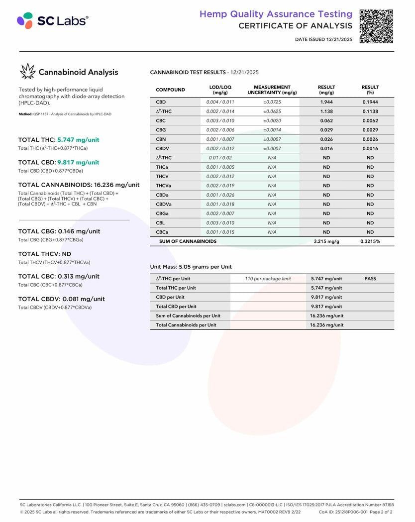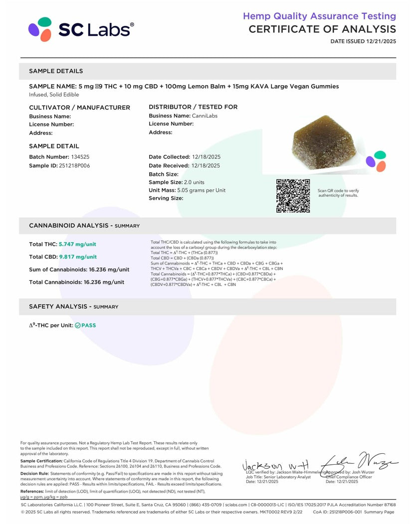 • Designed to support stress relief and calm • Balanced THC + CBD for body and mind relaxation • Infused with Lemon Balm & Kava • Vegan, all-natural, 3rd-party tested