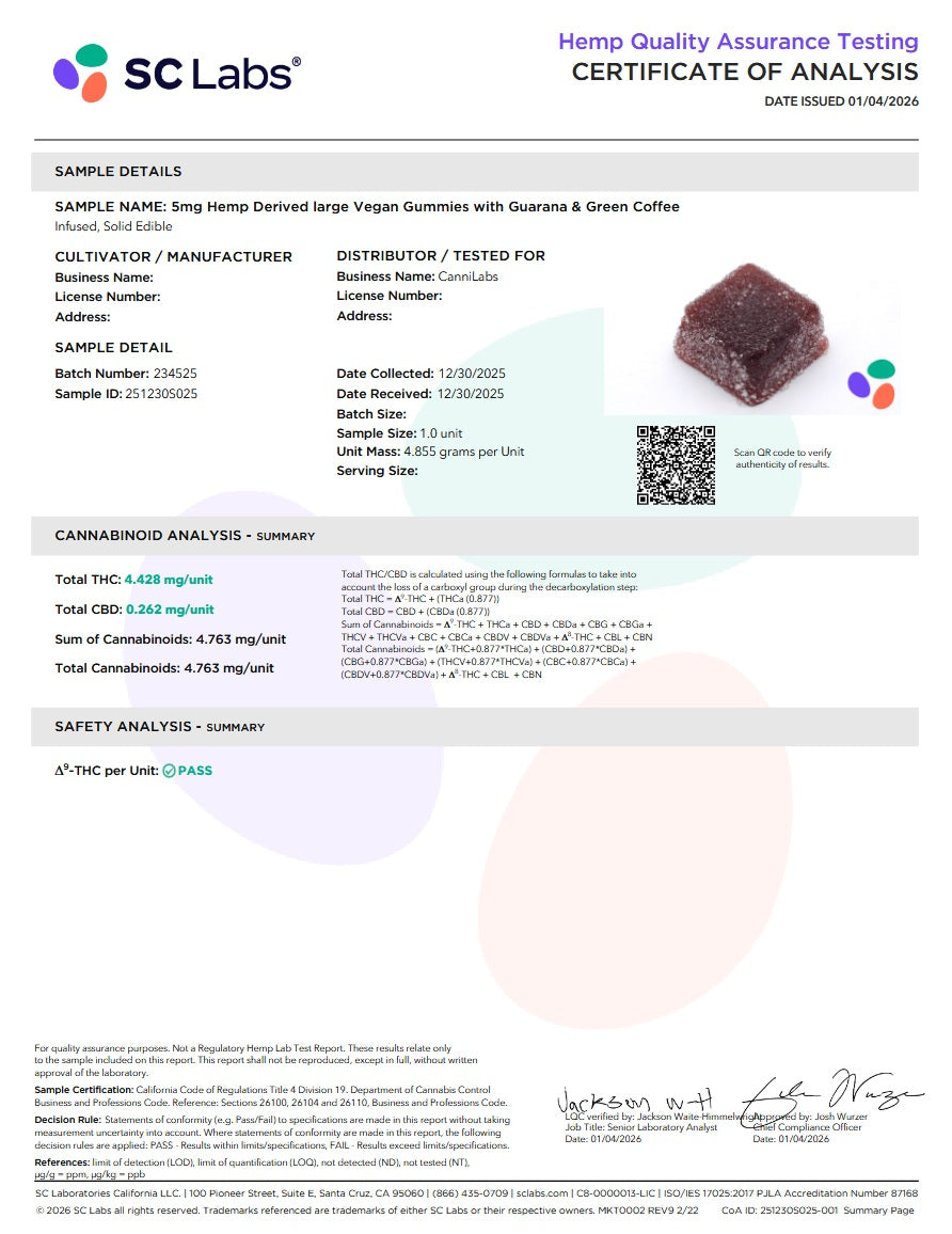 Potency per Gummy: 5 mg Δ9-THC · ~0.26 mg CBD · Guarana Extract · Green Coffee Extract